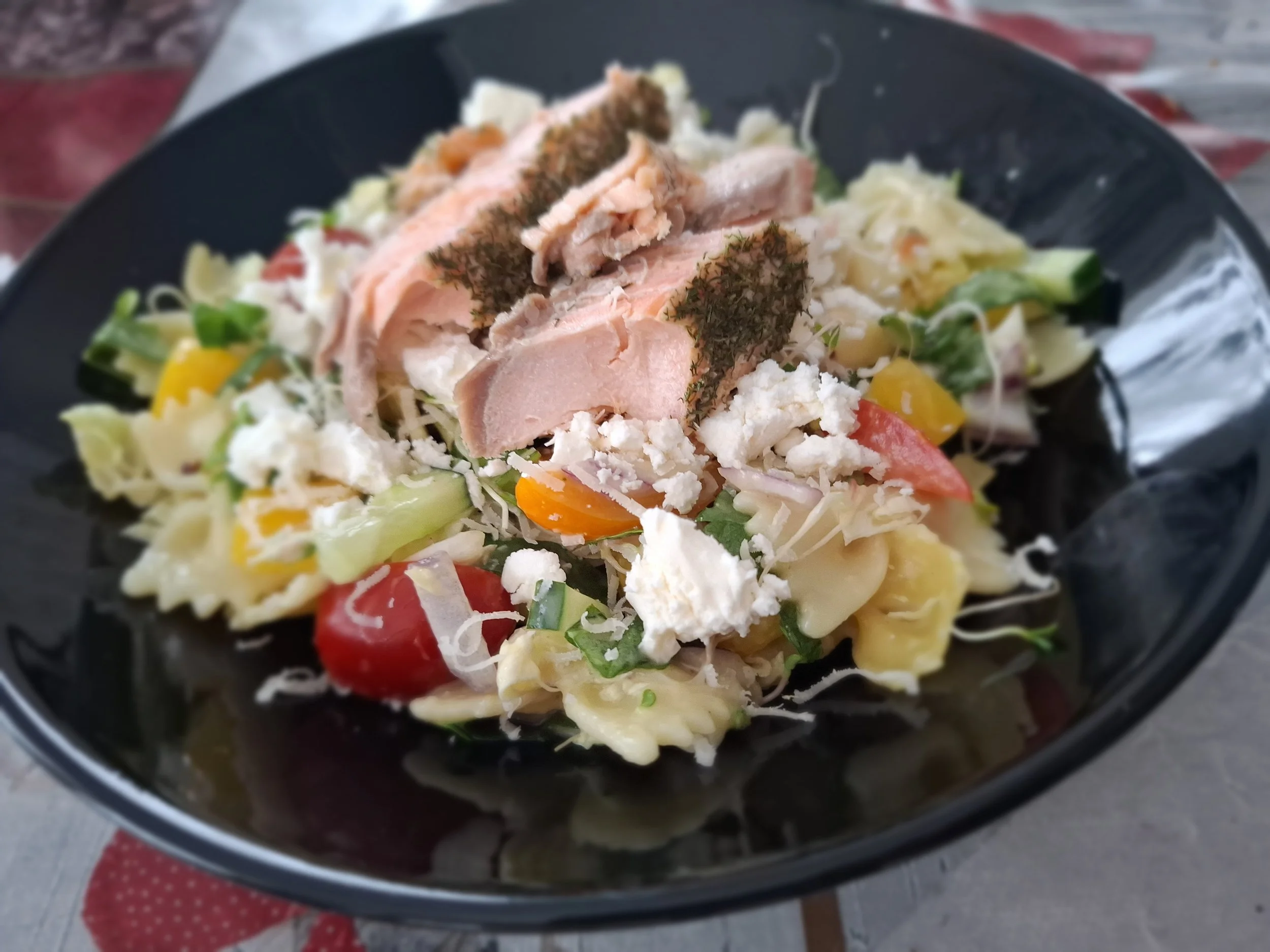 Lisäsin pastasalaattiini vielä uunilohta ja fetajuustoa!